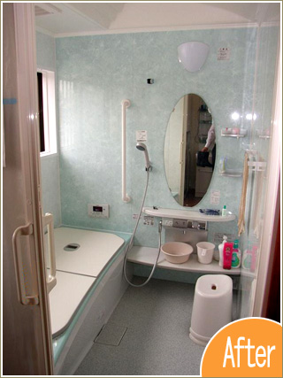 リフォームアドバイザー 松本勇人より以前は浴室と洗面室の間に段差があり、つまづくことが多かったようです。今回ユニットバスにして、段差も解消され、手すりも付けましたので転倒することもなくなったと喜んでいただけました。