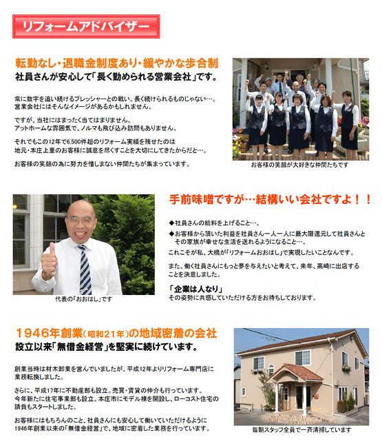 代表の大橋をはじめ、商売ベタな人間ばかりですが、お客様に喜んでいただくことが大好きな「あったか住まいのプロ集団」です。あらゆる住宅に関するお悩みは是非塗替え本舗までご相談下さい。